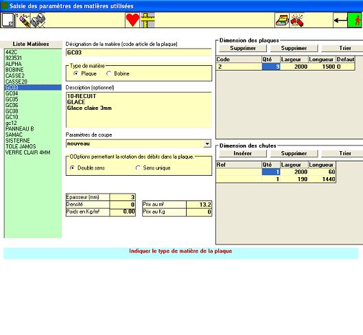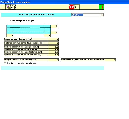 • Paramétrage : ré-équerrage de la plaque, épaisseur lame de coupe, dimensions chutes jetées / facturées, etc.