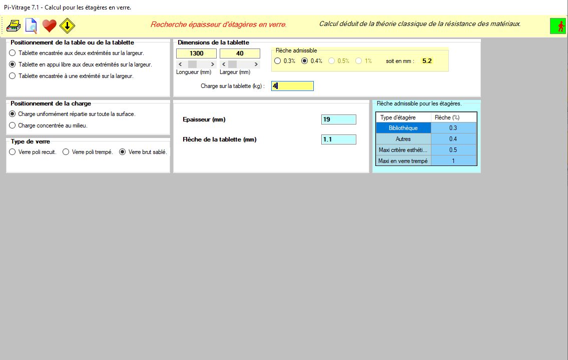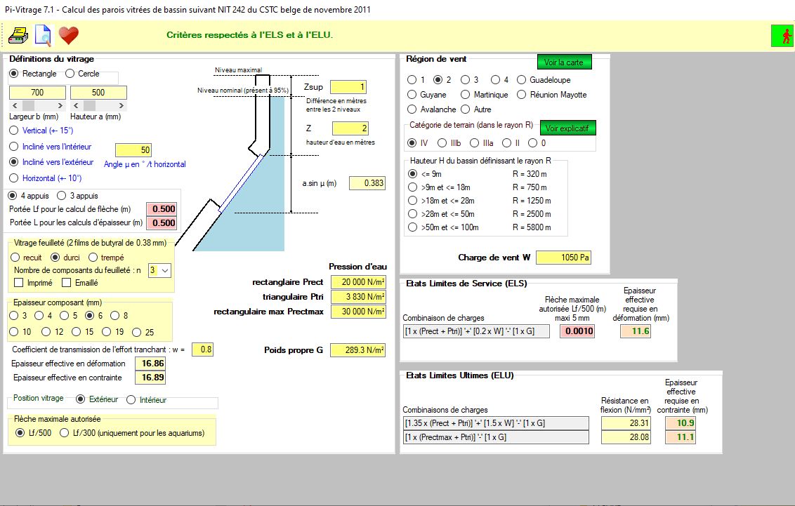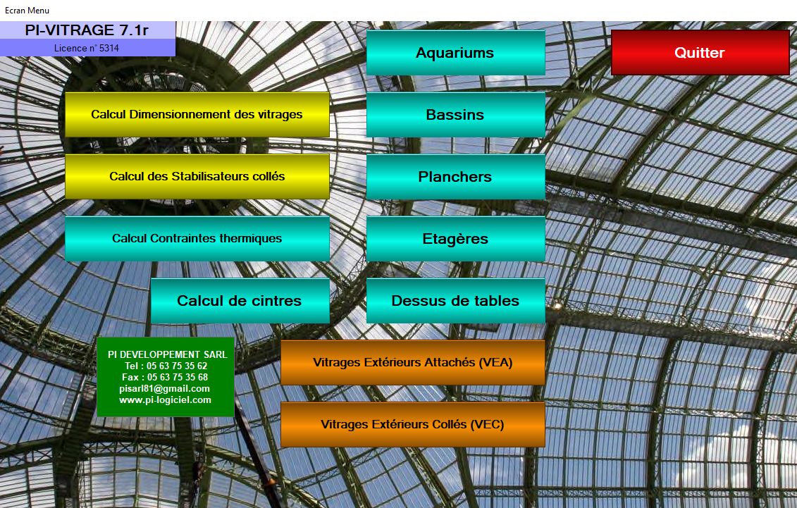 Pi-Vitrage est un logiciel de détermination des épaisseurs des vitrages, des glaces d’aquariums, des bassins, des dalles de plancher en verre, des étagères en verre, du VEA (Vitrage extérieur agrafé) et du VEC (Vitrage extérieur collé).