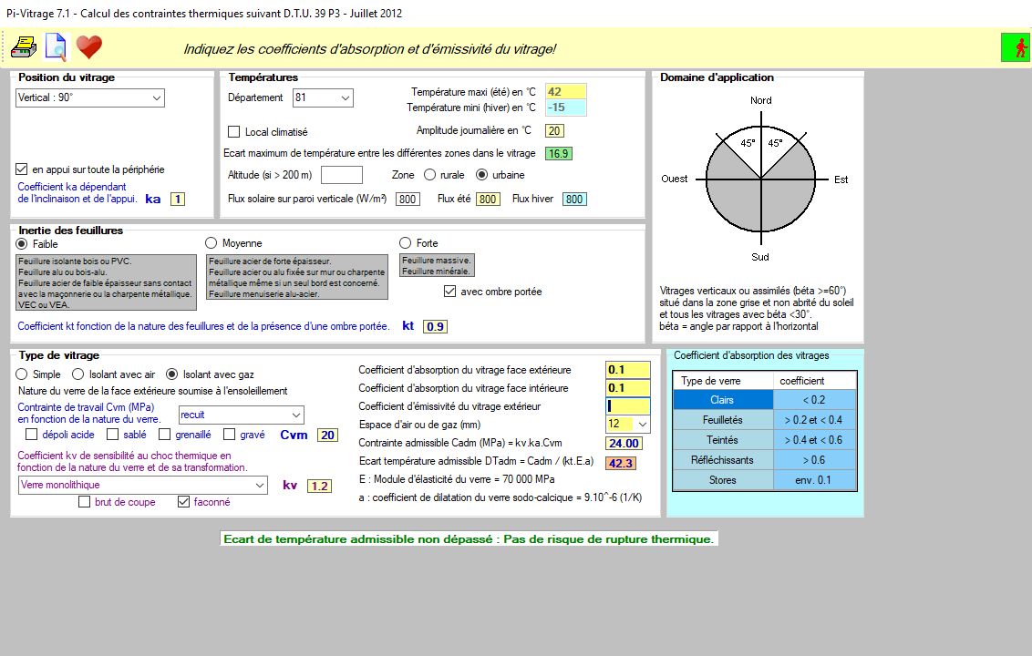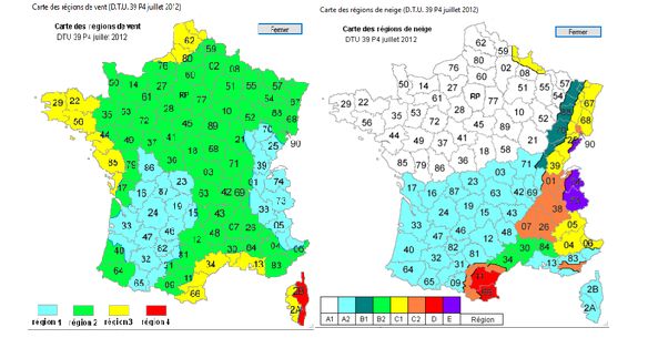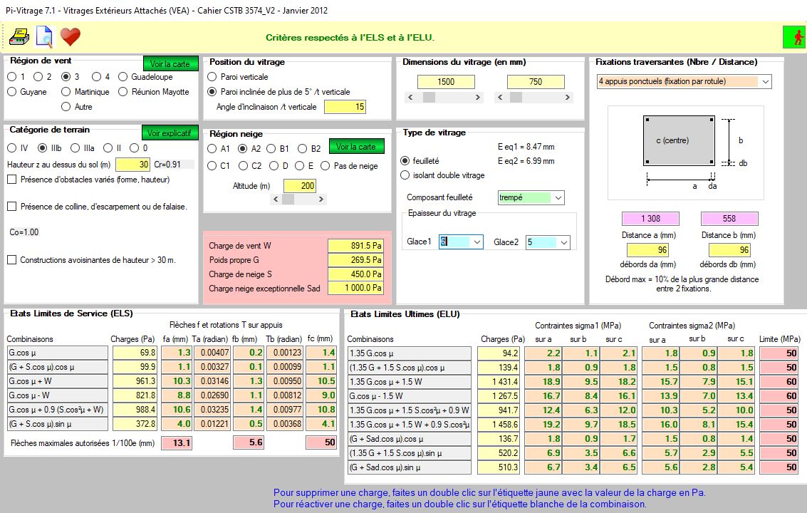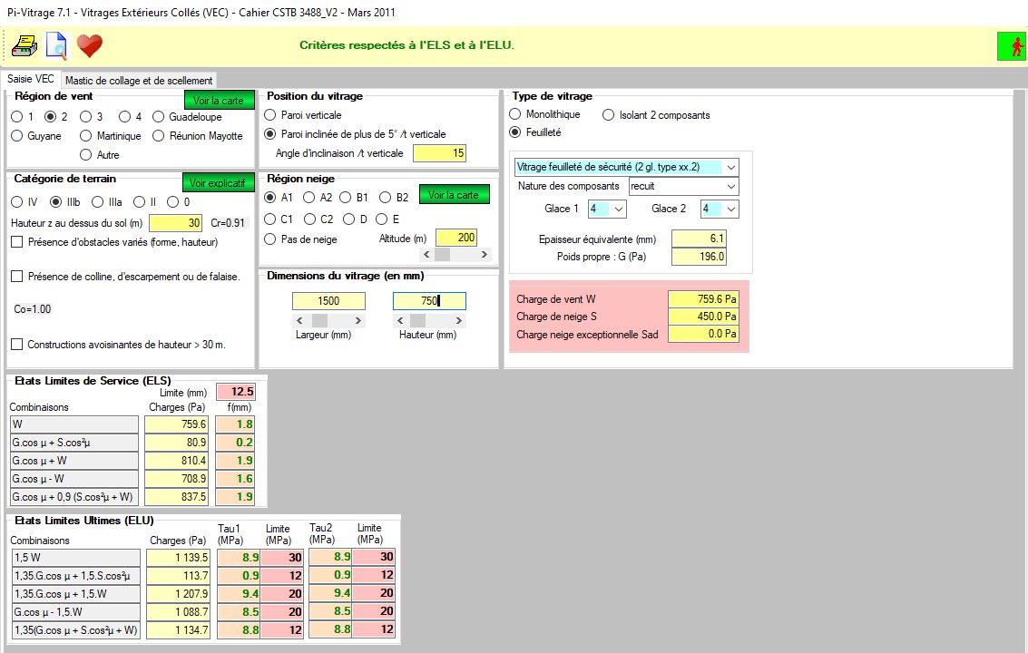 - Calcul automatique du vitrage selon la norme NF DTU 39 de juillet 2012 et les spécifications de Cahiers du CSTB.