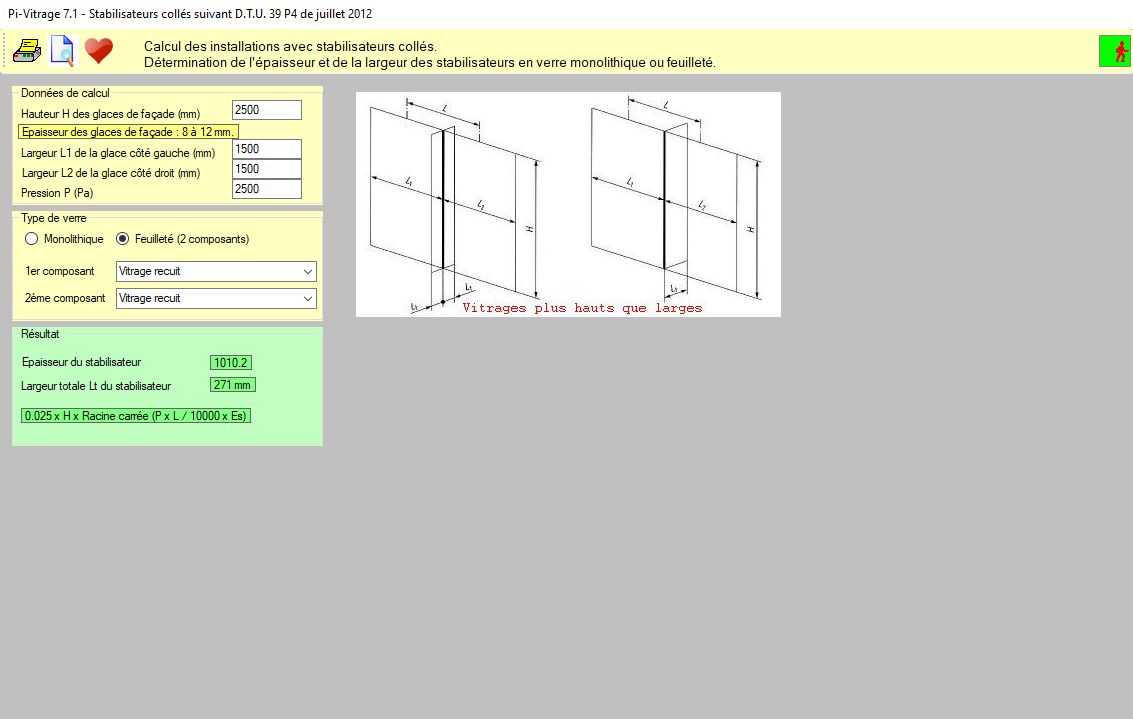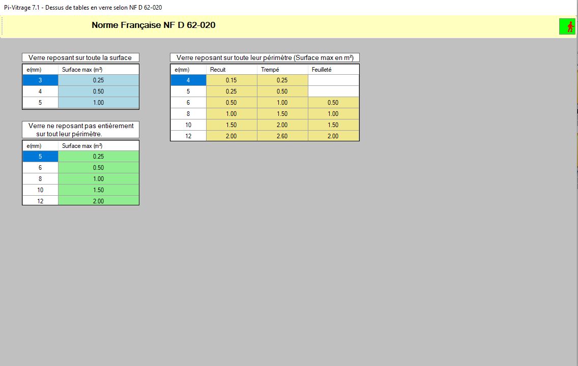 Pi-Vitrage prend en compte les normes NF DTU 39 P4 pour le calcul d’épaisseur de vitrages pour les constructions et les stabilisateurs collés. Les dalles de sol en verre sont calculées selon les normes 3443 des cahiers du CSTB.